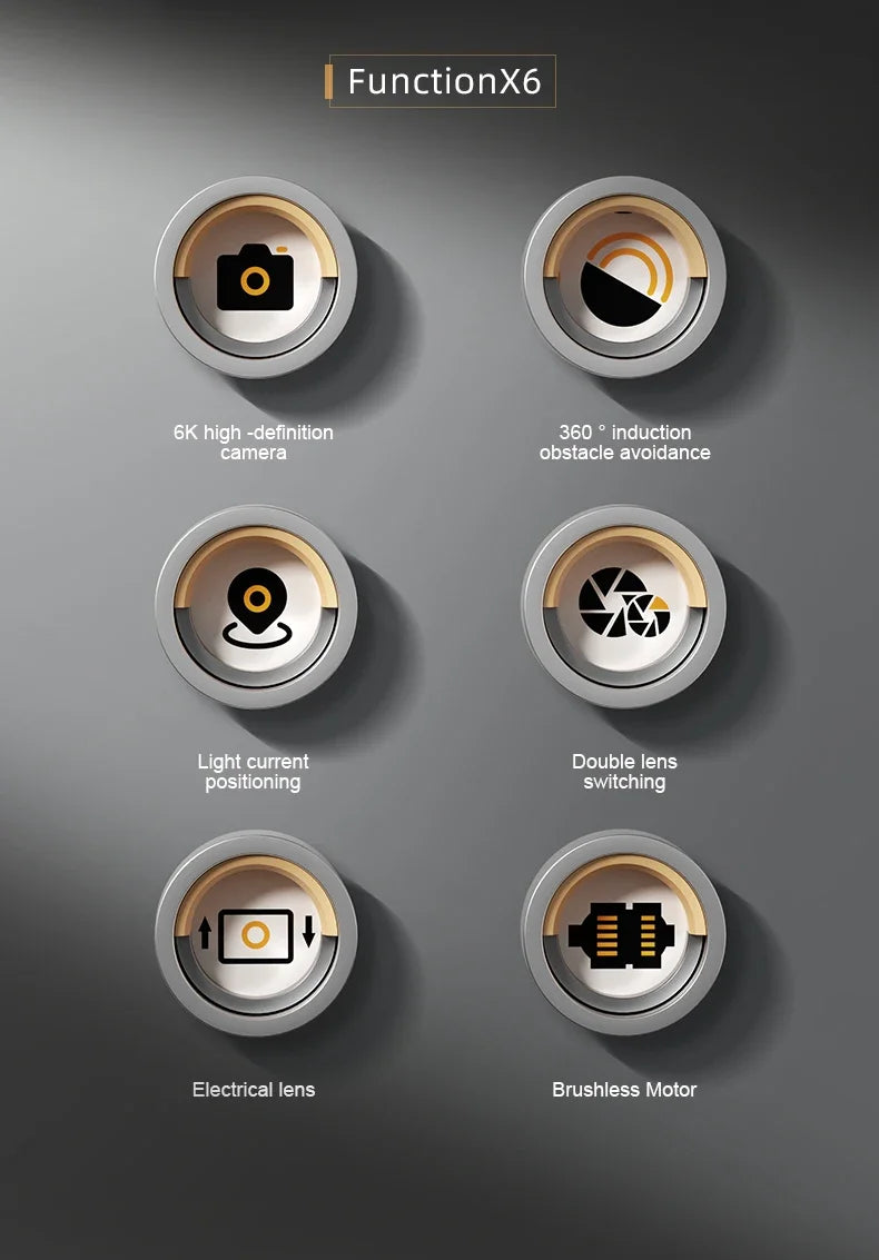 Características: 1. Lente frontal con gran angular 6K de alta definición por wifi; lente inferior de alta definición con flujo óptico que permite ajustar el ángulo de la cámara; control panorámico/inclinación servo para mayor estabilidad; y sistema antivibración electrónico EIS para una imagen más nítida.